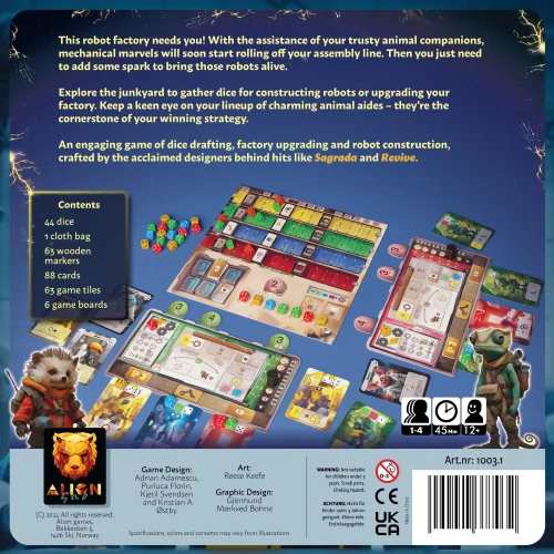 Játékosszám: 1-4 fő Kinek tetszene? Kinek nem tetszene? Milyen világban játszódik? Mitől izgalmas? Tényleg robotokat fogunk építeni, amikhez némi nyersanyag és kocka kell. Mivel egyszerre többet is készíthetünk, a kockadobás nem olyan jelentős, mert mindenre szükségünk lehet. Az erőforrásaink kezelése kicsit a Hadarára emlékeztet, minden sávra ügyelnünk kell, viszont rengeteg bónuszt kaphatunk segédeink, a jópofa állatkáink által. A játék kinézete nagyon színes, így átlátható is, a komponensek pedig hangulatosak és strapabírók. |